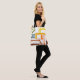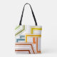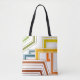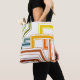This tote bag has an art deco design of lines in green, yellow, brown, orange, and blue.