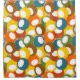 This show curtain has mid-century modern design of circles in blue, green, brown, sienna, yellow, and orange with white ovals inside.