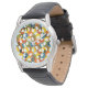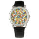 This men's watch has mid-century modern design of circles in blue, green, brown, sienna, yellow, and orange with white ovals inside.