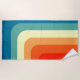 This beach towel has a 1970s design of concentric squares in retro shades of blue, white, and orange.