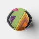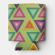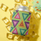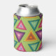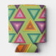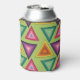 This can cooler has a 1970s design on concentric triangles in shades of teal, orange, yellow, purple, and pink on a field of green.