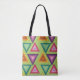 This tote bag has a 1970s design on concentric triangles in shades of teal, orange, yellow, purple, and pink on a field of green.