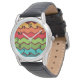 This watch has a 1970s design of zigzag lines in yellow, orange, red, green, and blue on a field of brown.