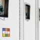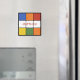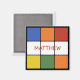 This simple geometric design of square in bright primary colours of orange, blue, red, green, yellow and white set against a black background has a retro 1980s feel. Add your own name or other text to create your own personalised square fridge magnet. Makes a great small gift or stocking stuffer.