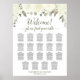This 19 table wedding seating chart is features a rustic boho chic floral design with a bevy of hand painted watercolor roses, blossoms, and flowers in shades of ivory, white, and cream, along with eucalyptus leaves and garden greenery. The title reads "Welcome! please find your table" in lacy sage green script calligraphy. There is space for the names of the couple and wedding date. This chart has table assignments for 190 guests at 19 tables with 10 seats per table.