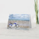 A blue motor cycle standing on a beach with fluffy clouds in the sky. Happy Birthday written in rock reflected in the water lying on the sand.