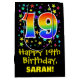 This vibrant, fun, and exciting birthday themed gift bag design features a large number "19" with a rainbow spectrum gradient style pattern, along with the message "Happy 19th Birthday,", and an editable recipient name. It also has a background pattern featuring star shapes of various sizes and colours. A birthday themed giftbag like this might be a fun way to wrap a gift or present being given to celebrate somebody’s 19th birthday. [~Z0000510]