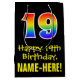 This fun, exciting, and colourful birthday themed giftbag design features a large number "19" with a rainbow spectrum gradient style pattern, along with the message "Happy 19th Birthday,", and a customisable recipient name. The background is coloured black. A fun gift-bag like this might be used when wrapping presents being given to somebody in celebration of their nineteenth birthday. [~Z0000512]