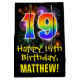 This exciting, colourful, and fun birthday giftbag design features a large number "19" with a rainbow spectrum gradient style pattern, along with the message "Happy 19th Birthday,", and a custom recipient name. It also has a colourful background pattern inspired by bursting celebratory fireworks. A birthday themed gift-bag like this might be a fun way to wrap a gift or present being given to celebrate somebody’s nineteenth birthday. [~Z0000509]