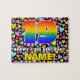 This bold and exciting birthday themed jigsaw puzzle design features a large number “19” with a multicolored rainbow spectrum inspired gradient pattern, along with the message “HAPPY 19th BIRTHDAY,”, and a personalised recipient name. The background features a cheerful pattern of loving hearts of various colours and sizes. A fun, customised birthday puzzle like this might be given in celebration of somebody’s nineteenth birthday. [~Z0000611]