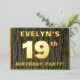 The front of this bold nineteenth birthday celebration/party foil invitation card features a customisable name, a large number “19th”, the message “BIRTHDAY PARTY!”, and a border, all in foil. The background of the front features a rustic, yet elegant, faux wood grain appearance inspired pattern. The back features personalised details about the event, such as the date, time, venue/location, and any other relevant information. Customised invitations like these might be used to invite guests/attendees to a birthday gathering/party being held in celebration of somebody’s 19th birthday. [~Z0000598]