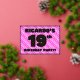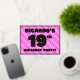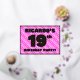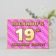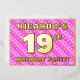 The front of this upbeat nineteenth birthday celebration foil invitation card design features a custom name, a large number “19th”, the message “BIRTHDAY PARTY!”, and a border. The background of the front has a loving pattern with light pink and dark pink stripes and heart shapes. The back features personalised details about the event, such as the date, time, venue/location, and any other useful information. Personalised invitations like these might be a fun way to invite guests to a birthday party/gathering being held in celebration of somebody’s 19th birthday. [~Z0000603]