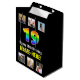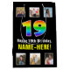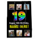 This eye-catching and fun birthday themed gift bag design features a large number “19“ having a vibrant rainbow spectrum inspired gradient pattern, plus the message “Happy 19th Birthday,“ and a customisable recipient name. The photos above and below the message can be personalised, perhaps with photos of the recipient, the recipient’s family and friends, and/or the sender(s) of the gift. A bold birthday themed giftbag like this might be a fun way to wrap a present or gift being given to somebody who is celebrating their nineteenth birthday. (Photography © Storytree Studios, Stanford, CA.) [~Z0000669]