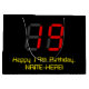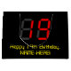 This silly and geeky birthday gift bag design features a large number "19" having a red seven segment digital display inspired look, along with the message "Happy 19th Birthday," and an editable name in geeky yellow text, on a black coloured background. Editable gift bags like this might be used when wrapping presents or gifts being given to celebrate somebody’s nineteenth birthday. [~Z0000389]