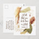 Inspirational quote scripture postcard depicts an elegant modern abstract design in warm trendy colours of blue, plum and beige with gold line art flowers. It features Bible Verse 1 Corinthians 16:14, "Let all that you do be done in love."_