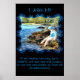 1 John 1:9: If we confess our sins, he is faithful and just and will forgive us our sins and purify us from all unrighteousness.On a poster With a baby boy fishing in the river with a stick as a rod and a blue hat on. His feet in the water and a light blue frame.Realistic artwork created from oil paintings.