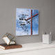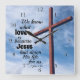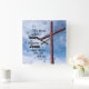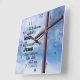 Scripture wall clock depicts a blue sky with a wooden cross and features a portion of Bible Verse 1 John 3:1, We know what love is because Jesus laid down His life for us. Photograph by Aaron Burden.