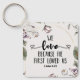 Inspirational quote scripture keychain depicts a simple floral design with white and lilac flowers and leaves. It features Bible Verse 1 John 4:19, "We love because He first loved us."