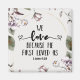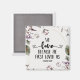 Inspirational quote scripture magnet depicts a simple floral design with white and lilac flowers and leaves. It features Bible Verse 1 John 4:19, "We love because He first loved us."