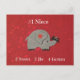 Cute elephant with red heart on it's ear and ribbon around it's trunk. Background is red with pink hearts and message reads: "#1 Niece 2 Sweet 2 Be 4 Gotten" (Elephants never forget!) Show your Niece how special she is to you on Valentine's Day with this precious post card!