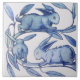 This is the right facing (left side) of a pair of tiles designed by William De Morgan (1839-1917). Each tile shows three blue rabbits chasing each other along a leafy vine. The other "Running Rabbits" tile is listed separately. The originals date to the late 19th century.
