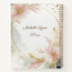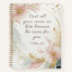 Personalised notebook, journal with Christian inspirational quote scripture depicts an elegant floral watercolor with a simple gold frame and graceful blush pink flowers and greenery. It features an encouraging Bible Verse from 1 Peter 5:7, "Cast all your cares on him because he cares for you." Customise the back with a name and year or details of your choice.