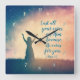 Beautiful clock depicts a women in a field with her hands lifted to the Lord. It features Bible Verse 1 Peter 5:7, Cast all your cares on him because he cares for you.-