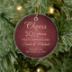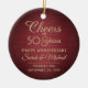 Cheers and Happy Anniversary! Celebrate any year wedding anniversary with a custom photo red and gold round ceramic ornament. Picture, number of years, couple's names, and marriage date on this template are all simple to personalize. Design features a burgundy faux brushed metallic background, vintage art deco style typography, elegant script calligraphy, and one photo of your choice. This stylish modern keepsake ornament adds an elegant touch to Christmas home decorations and makes a unique Xmas gift idea. Please note that gold is printed color, not metallic foil.