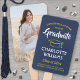 Add a cool personalised touch to a college or high school graduation party with these custom photo navy blue, white and yellow gold hand fans. Design features one picture of the graduate, stylish modern typography, handwritten style script calligraphy, and a customisable message reading "Congratulations to our Graduate". Text at the bottom includes class year, school name, and an optional line for degree, honours, or favourite inspirational quote, thanks mum and dad, or other info. All text is simple to personalise. Please note that gold is printed colour, not metallic foil. Makes an elegant customised idea for graduation party favours and decorations and is perfect for displaying a favourite photo, such as a senior picture or image from the commencement ceremony. Congratulations to the graduate!