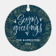 This festive double-sided ornament features a full photo and fun lettering. The front features a full family photo. On the back, white lettering reads "Season's Greetings" with your name and holiday year below. The typography design is framed by a gold wreath against a navy blue background.