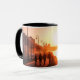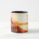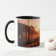 Coffee mug with inspirational quote Christian scripture depicts a photograph with the sun setting over the water and four friends walking on the dock. It features a portion of Bible Verse 1 Thessalonians 5:11, "Encourage one another and build each other up."