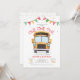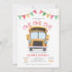 The invitation features a yellow bus illustration with colourful confetti and party flags.