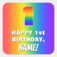 This cheerful and joyful birthday themed square sticker design features a large number “1” with a colourful rainbow spectrum inspired gradient pattern, along with the message “HAPPY 1st BIRTHDAY,”, and a customisable recipient name. The background also features a vibrant multicolored rainbow spectrum inspired gradient pattern. Exciting, fun, personalised stickers like this might be given as a birthday gift, or used while wrapping gifts/presents, or perhaps used as birthday party decorations when celebrating somebody’s first birthday. [~Z0000571]