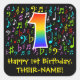 This fun, vibrant, and colourful birthday-themed sticker design features a large number "1" having a rainbow spectrum gradient inspired pattern. It also features the message "Happy 1st Birthday,", and an editable name. Part of the background has a colourful music notes and symbols pattern. Fun, personalised birthday stickers like this might be used as a birthday celebration decoration, or perhaps be used when wrapping birthday presents being given to celebrate somebody’s first birthday. [~Z0000423]