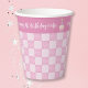 This sweet and whimsical paper cup is filled with an adorable pink chequerboard design, with room at the top to add text celebrating your little ones first birthday. This is part of the 1st Birthday Cupcake collection, look for coordinating plates, favour bags, invitations and more.