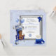 Vintage baby in royal blue diaper with crown. He is sitting on a royal blue and silver velvet throne with a banner that reads 1st Birthday with a bouquet of balloons tied to the chair. The frame is embellished with a royal blue ribbon and rose. Personal message is found on the scroll in the box on the bottom right. Perfect for a special little prince! Place for the birthday boy's photo on the back.