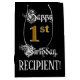 This opulent and luxurious birthday giftbag design features the message “Happy 1st Birthday,”, along with a personalised recipient name. Part of the message is in an ornate script-style text, the large number “1st” features a faux/imitation gold-inspired look pattern, and the background is coloured black. An elegant birthday themed gift bag like this might be a respectable way to wrap a gift or present being given to celebrate somebody’s first birthday. [~Z0000560]