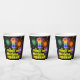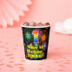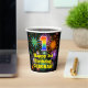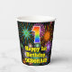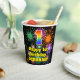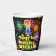 This colourful and cheerful birthday-themed paper cup design features a large number “1” with a rainbow spectrum gradient inspired pattern, along with the message “Happy 1st Birthday,”, and a personalised name. The background features a vibrant and colourful bursting celebratory fireworks inspired pattern. Colourful, vibrant paper cups like this might be fun to use at a birthday celebration being held in celebration of somebody’s first birthday. [~Z0000539]