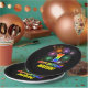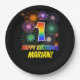 This cheerful, colourful, and fun birthday-themed paper plate design features a large number "1" and the message "HAPPY BIRTHDAY,", both coloured with a rainbow spectrum gradient inspired pattern, along with a bold yellow custom name. It also features a exciting and vibrant bursting celebratory fireworks inspired pattern. It has a black coloured background. Fun, personalised paper plates like this might be used at a birthday party being held to celebrate somebody’s 1st birthday. [~Z0000489]
