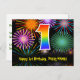 The front of this colourful, exciting, and fun birthday themed postcard design features a large number "1" with a rainbow spectrum gradient inspired pattern, along with the message "Happy 1st Birthday,", and a custom recipient name. The front additionally features a vibrant and colourful background pattern inspired by the appearance of bursting celebratory fireworks. The back features a personalised birthday greeting message, or could perhaps be cleared and left blank if a message is to be written by hand instead. A personalised birthday postcard like this might be a fun way to send a message celebrating somebody’s first birthday. Postcards like this might also be used to invite guests to a birthday party or celebration being held for somebody who is turning 1 year old. [~Z0000446]