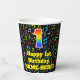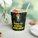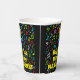 This joyful and exciting music themed birthday paper cup design features a large number “1” with a rainbow spectrum gradient inspired pattern, along with the message “Happy 1st Birthday,”, and a personalised name. The background features a vibrant and colourful pattern of various music notes and symbols of different colours and sizes. Colourful, vibrant paper cups like this might be fun to have at a birthday party/celebration being held to celebrate somebody’s first birthday. [~Z0000541]