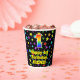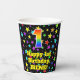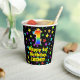 This cheerful and joyful birthday paper cup design features a large number “1” with a rainbow spectrum gradient inspired pattern, along with the message “Happy 1st Birthday,”, and a customisable name. The background features a multicolored pattern featuring many star shapes with different colours and sizes. Vibrant, colourful paper cups like this might be fun to use at a birthday celebration being held to honour somebody’s first birthday. [~Z0000540]