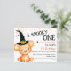 Customisable 1st birthday affordable paper invitation, featuring a cute teddy bear wearing a spooky Halloween hat with rainbow sprinkle orange confetti, and a orange stripe reverse.