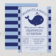 Invite your guests in style to your son's 1st birthday party with this cute nautical themed flat invitation. This coastal inspired design features light blue and navy striped background with a cute blue whale with stars coming out of its spout. The words above the whale read "Splash! It's A Party!" Below is your child's name and your party details for you to personalise. The back of the card is matching light blue and navy stripes. Perfect for first birthdays or change to the year of your choice.
