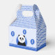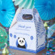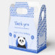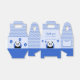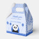 A smiling panda and blue party balloons decorate the front and back of this box in celebration of a boy or girl's first birthday. The text on the top and front of the box is fully editable and currently reads "Thank you" "FOR HELPING US CELEBRATE" "Roger's First Birthday". On the side of the box there is further editable text, with a suggestion to note the name of the recipient: "This party box belongs to". The box background colour is pale blue and a pattern of blue dots completes the design.