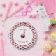 This smiling panda has a red balloon to celebrate a one year old's birthday. Editable text - add a name and a birthday greeting for example. There is a pattern of more smiling pandas on a pale pink background around the edge of the plate.