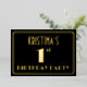 The front of this vintage-appearance first birthday party foil invitation features a personalised name, a large art deco look inspired number “1st”, the message “BIRTHDAY PARTY”, and a border pattern consisting of lines. The background of the front is coloured black by default, but it can be customised to a different colour if desired. The back features personalised details about the event, such as the date, time, venue, and any other important information. Elegant, luxurious, editable invitations like these might be used to invite guests to a birthday party being held in celebration of somebody’s 1st birthday. [~Z0000591]