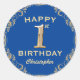 1st Birthday Party Blue and Gold Glitter Frame Classic Round Sticker
