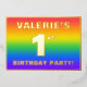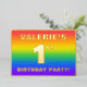 The front of this vibrant and exciting first birthday party/celebration foil invitation card design features a customisable name, a large number “1st”, the message “BIRTHDAY PARTY!”, and a border. The background of the front has a joyful, multicolored, rainbow spectrum inspired gradient pattern. The back features personalised details about the event, such as the date, time, venue/location, and any other relevant information. Customisable invitations like these might be a fun way to invite guests to a birthday party/gathering being held in celebration of somebody’s 1st birthday. [~Z0000599]