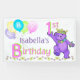 A 1st birthday celebration banner that will tickle your little girl’s fancy with cute purple bear princess, pastel balloons and delicate pink and yellow flowers. Girl’s name may be customised using the template provided. Original design by Anura Design Studio.